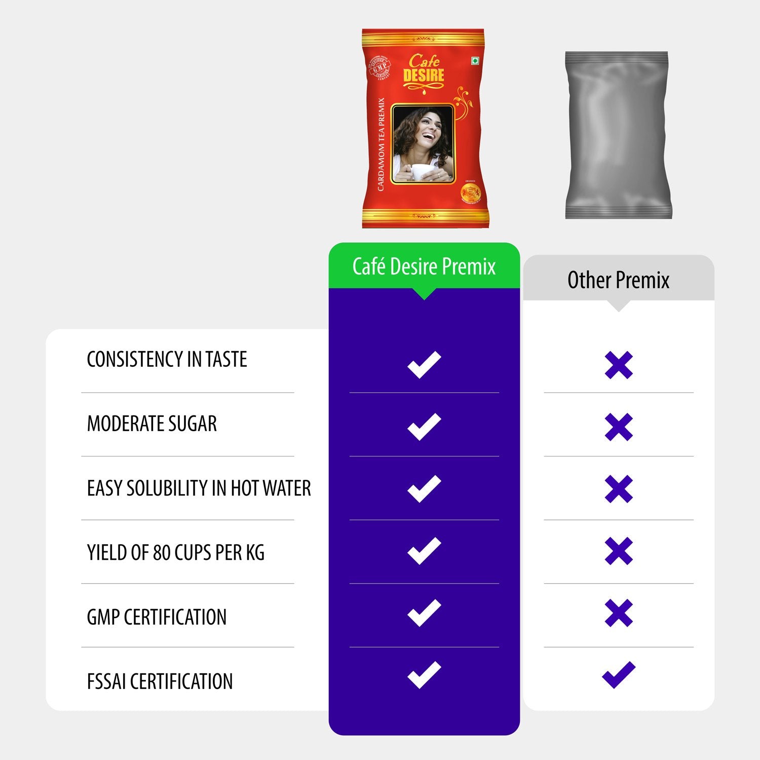 Cardomom Tea Premix is certified of FSSAI, GMP and HALAL. Taste: nice refreshing and delicious in taste, How to make: Just add 100ml hot water to cafedesire premix to enjoy your instant delicious cup of coffee, just like home-made, in less than a minute.