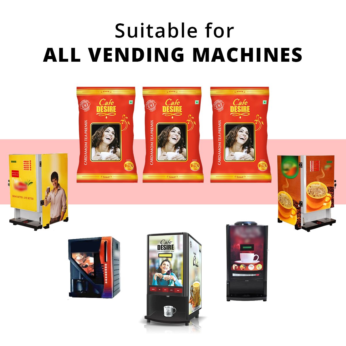 You can this premix tea in any brand of vending machine. You just need to cut the packet and pour the premix into the cannister provided inside the vending machine, press the button and your tea will be ready. Good news for vending machine users, if you are using Café Desire premixes than can get free online service support for any type of vending machine.
